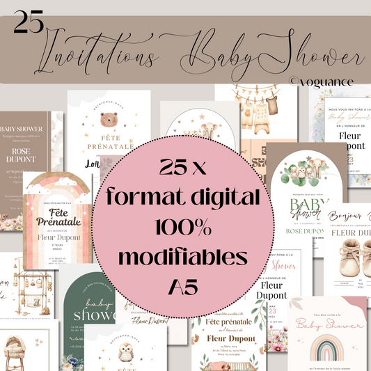 Lot de 25 Cartes d'Invitation Baby Shower Modifiables - Tons Neutres, A5
